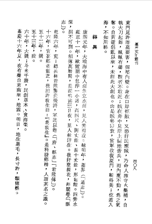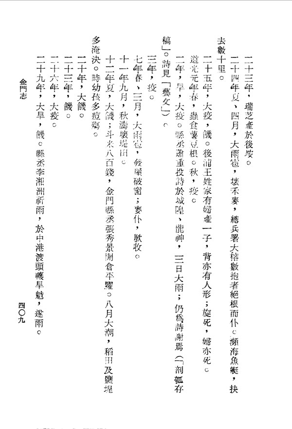 大饑荒斗米價昂,金門縣丞張秀景開糧倉平抑物價;稻田鹽埕因水災淹沒,小孩多得痘而死亡 金門志卷十六 台灣文獻史料叢刊 -