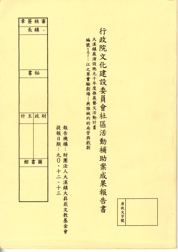 行政院文化建設委員會社區活動補助案成果報告書大溪鎮展演設施九十年度推展藝文活動計畫編號17:江之翠實驗劇場─典雅婉約的南管與戲劇 -