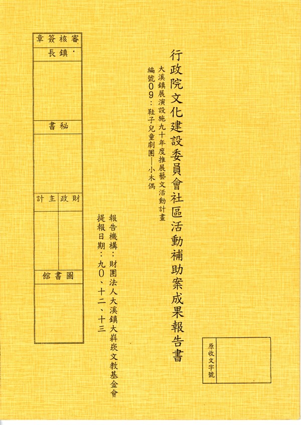 行政院文化建設委員會社區活動補助案成果報告書大溪鎮展演設施九十年度推展藝文活動計畫編號09:鞋子兒童劇團─小木偶 -