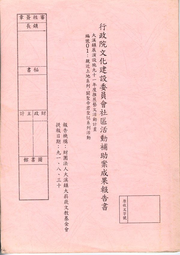 行政院文化建設委員會社區活動補助案成果報告書大溪鎮展演設施九十一年度推展藝文活動計畫編號01:親近土地系列─關聖帝君聖誕系列活動