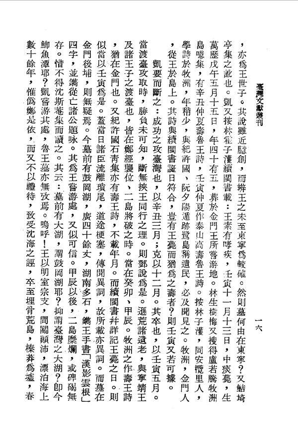 明監國魯王素有哮疾,中痰薨,葬於金門曾經旅遊之地 內自訟齋文選 台灣文獻史料叢刊 -