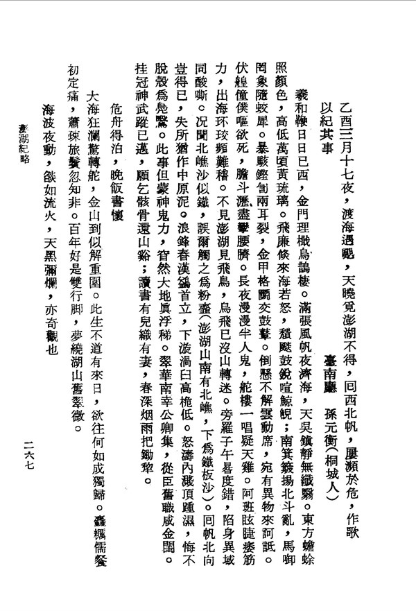渡海遇颱風,天曉覓澎湖不得,回西北帆,屢瀕於危,作歌以紀其事 澎湖紀略卷之十二 台灣文獻史料叢刊 -