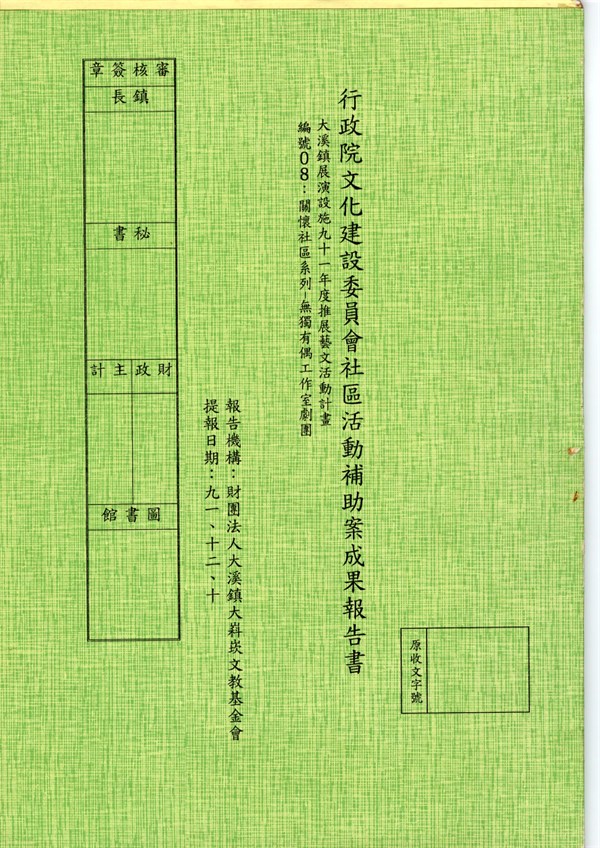 行政院文化建設委員會社區活動補助案成果報告書大溪鎮展演設施九十一年度推展藝文活動計畫編號08:關懷社區系列─無獨有偶工作室劇團 -
