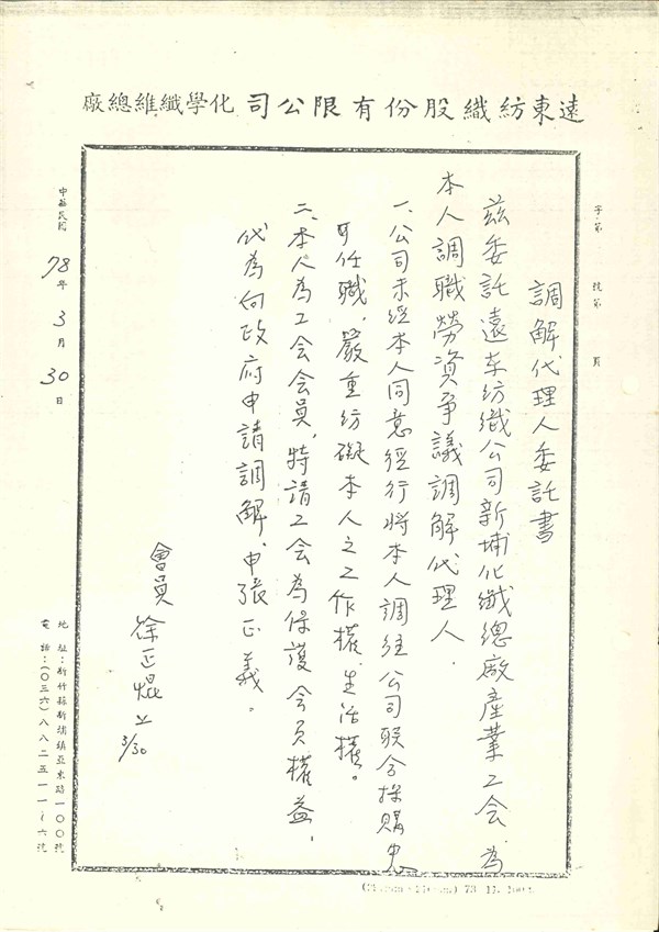 遠化罷工史料:遠東化纖工會正式受理會員代表徐正焜被違法調職之申訴案致新竹縣政府之公函 -