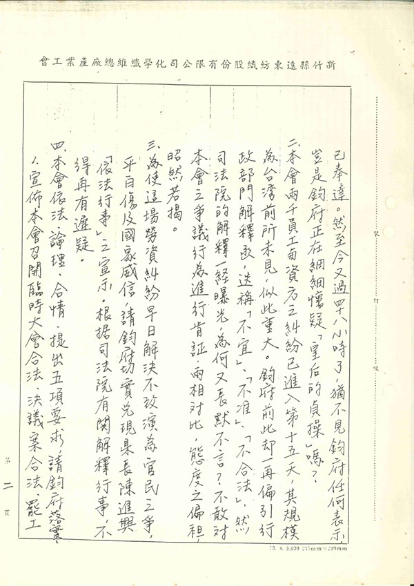 遠化罷工史料:遠東化纖工會依司法院解釋提出要求致新竹縣政府之公函 -