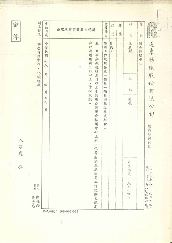 遠化罷工史料:遠東化纖工會會員代表徐正焜免職書 -