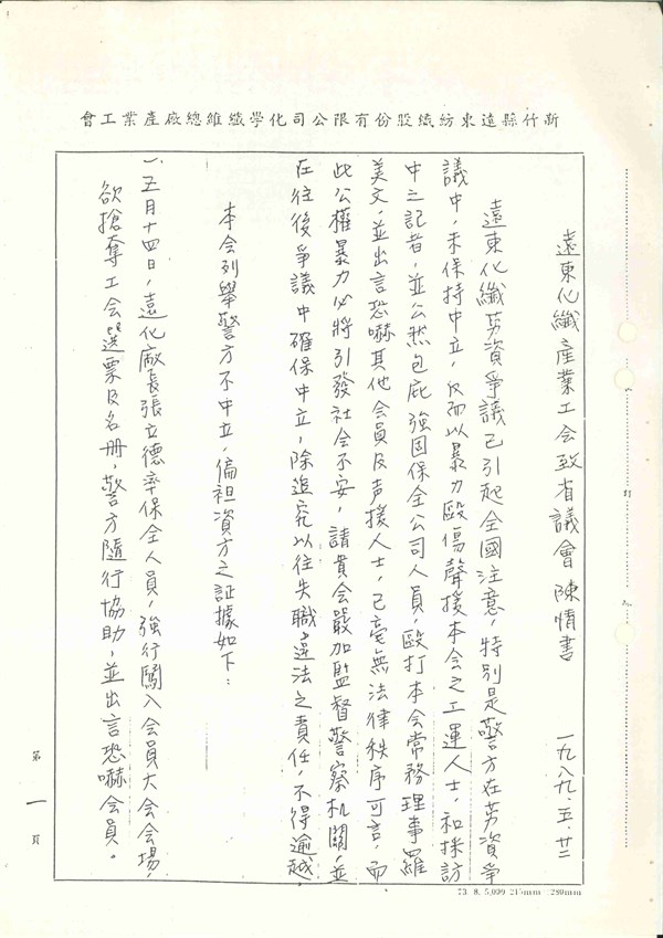 遠化罷工史料:遠東化纖工會致省議會陳情書 -