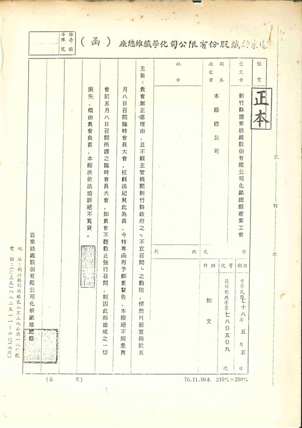 遠化罷工史料:遠東化纖總廠給遠化工會譴責召開臨時會員大會之公函