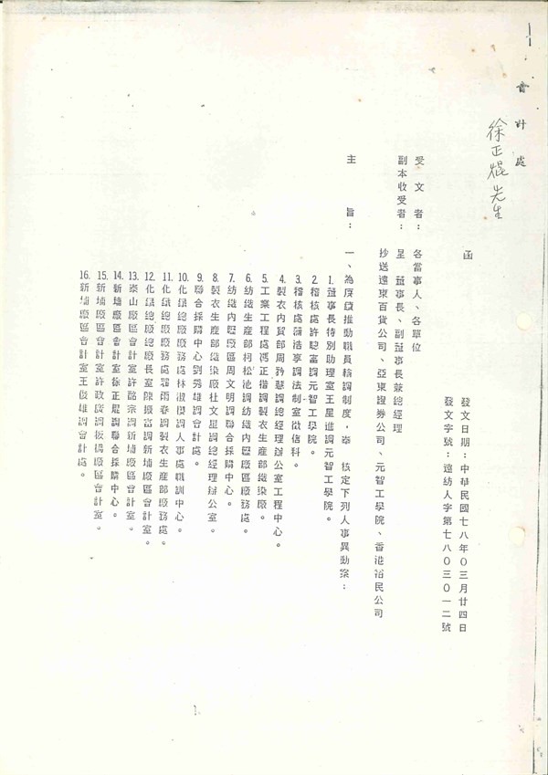 遠化罷工史料:遠東化纖工會會員代表徐正焜調職書 -