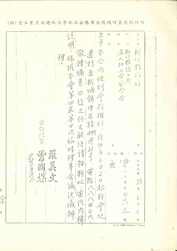 遠化罷工史料:遠東化纖工會為便利會務推行、變更會址電話之公函 -