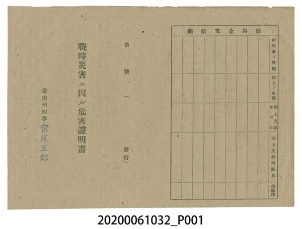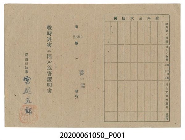 戰時造成的意外災害證明書第8865號(昭和20年5月30日發行) -