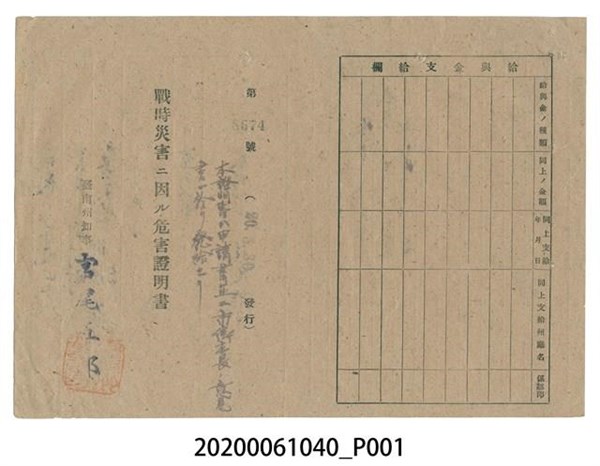 戰時造成的意外災害證明書第8674號(昭和20年5月30日發行) -