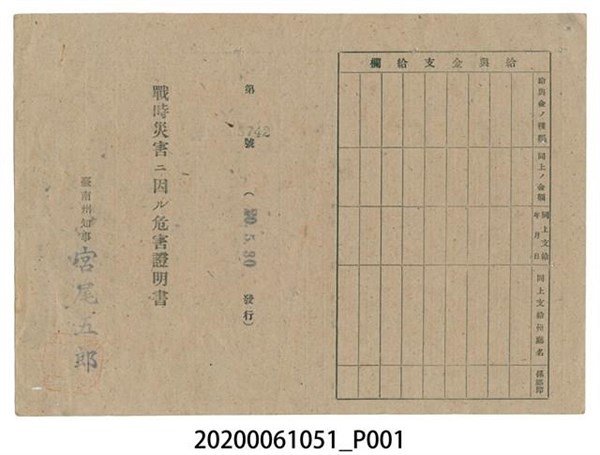 戰時造成的意外災害證明書第8742號(昭和20年5月30日發行) -