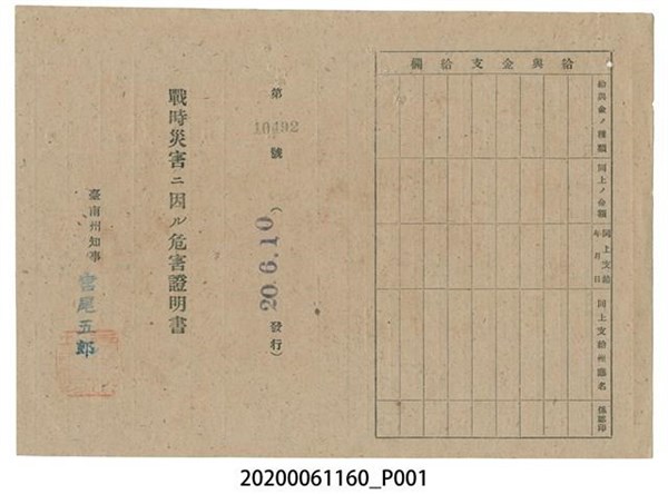 戰時造成的意外災害證明書第10492號(昭和20年6月10日發行) -