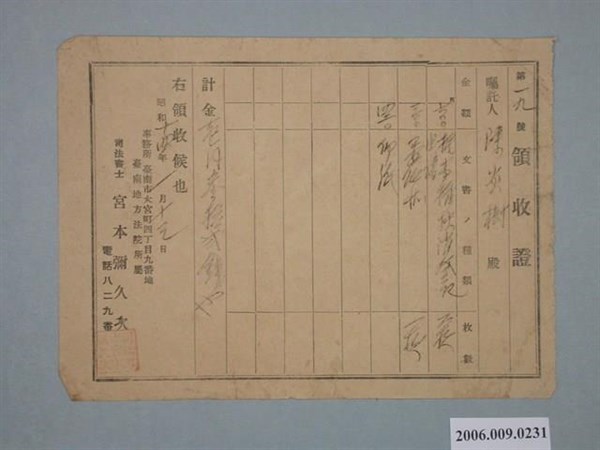 昭和14年司法書士宮本彌久次給陳炎樹收據 -