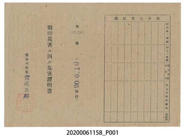 戰時造成的意外災害證明書第10490號(昭和20年6月10日發行) -