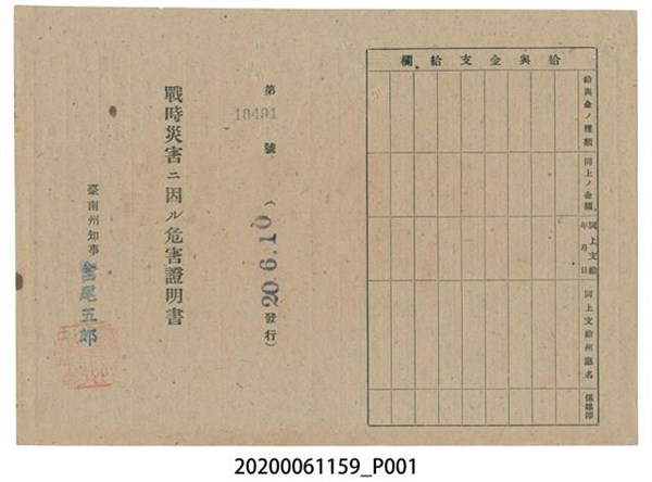 戰時造成的意外災害證明書第10491號(昭和20年6月10日發行) -
