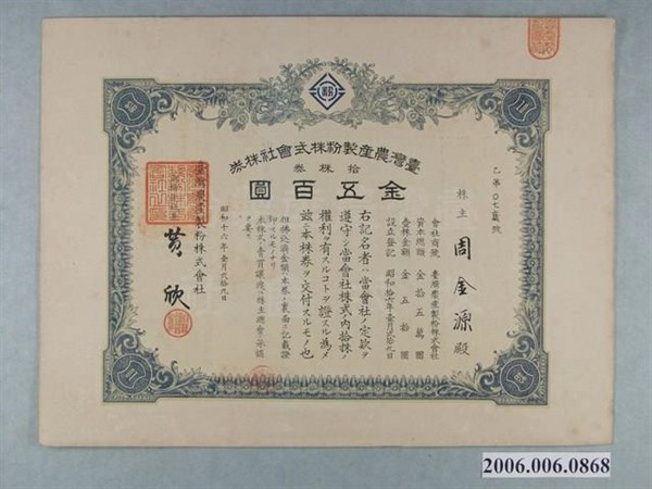 昭和16年周金源持有臺灣農產製粉株式會社之股份證明 -