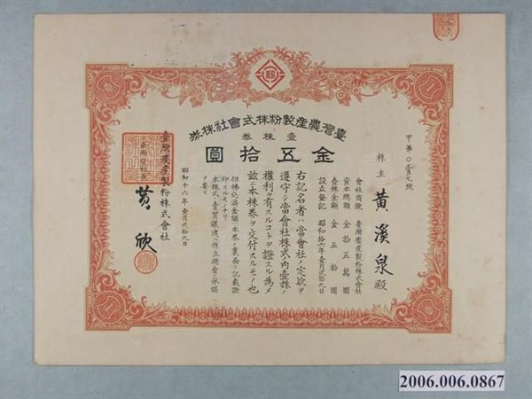 昭和16年黃溪泉持有臺灣農產製粉株式會社之股份證明 -
