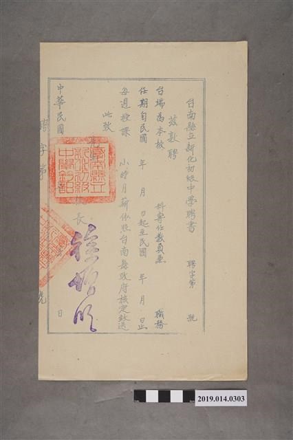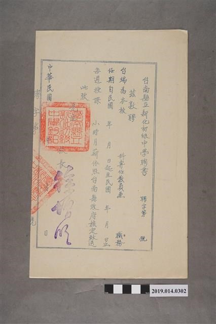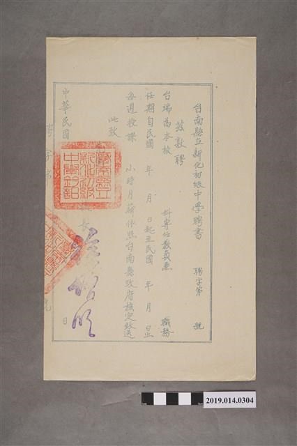校長徐曾明時期臺南縣立新化初級中學空白聘書 -