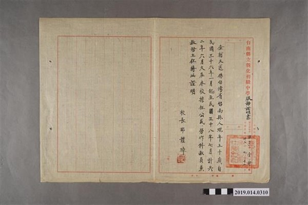 校長梁道時期臺南縣立新化初級中學空白聘書 -