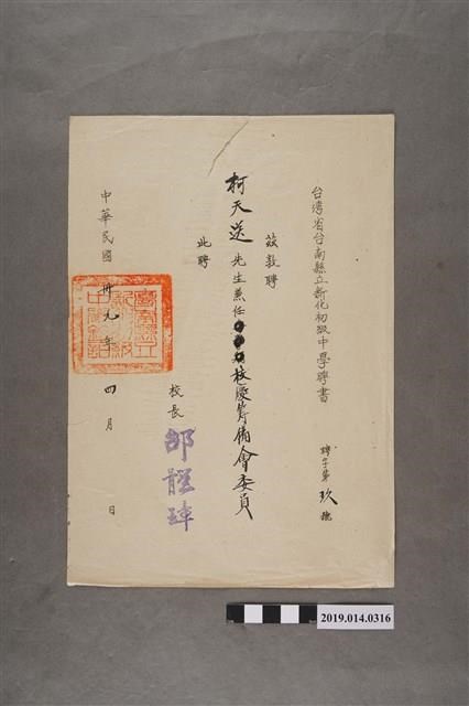 柯天送民國39年臺灣省台南縣立新化初級中學聘書(兼任校慶籌備會委員) -