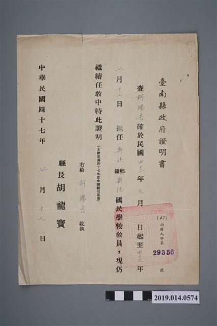 臺南縣政府民國47年7月17日右給柯瑞吉證明書 -