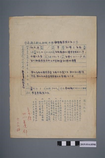 柯天送臺南縣立新化初級中學教職員聘(派)用審查證明文件簿 -