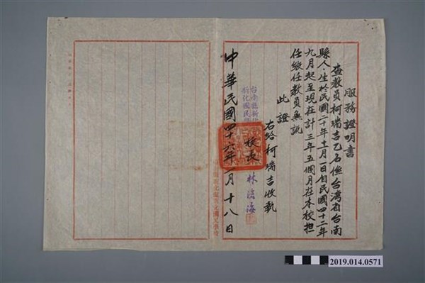 柯瑞吉臺南縣新化鎮新化國民學校民國46年1月18日服務證明書 -