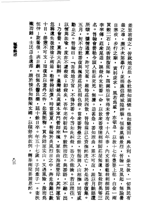 晉翰盛夏勞憊不堪又遇上意外,歸後病情加劇且無名醫良藥,十餘日後遂亡 恒春縣志卷三 台灣文獻史料叢刊