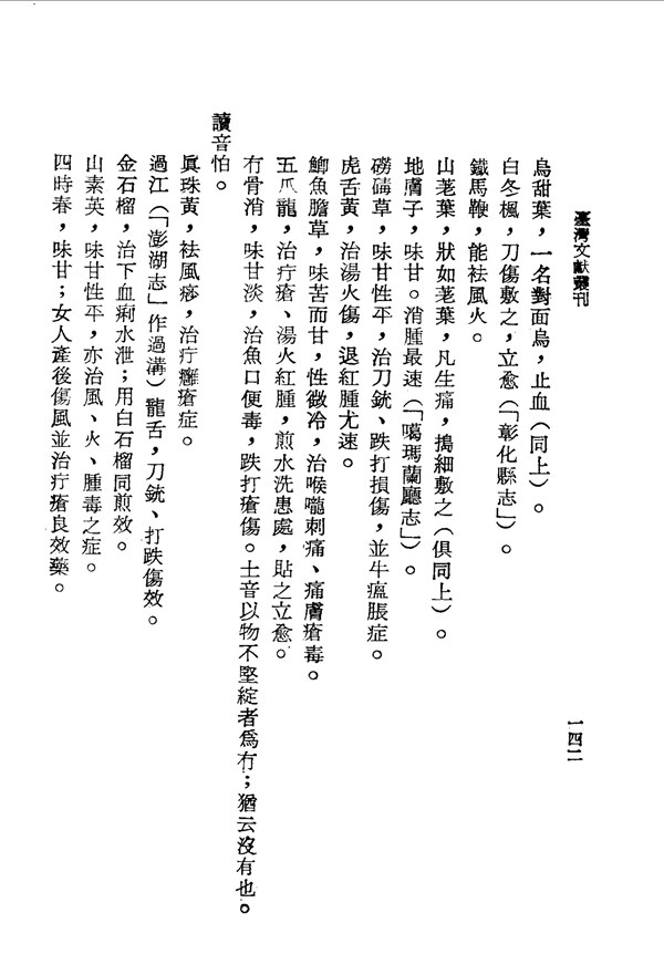 山荖葉可治痛症 臺灣通志 台灣文獻史料叢刊 -