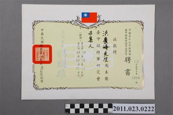 洪慶峰中國青年反共救國團1996年團務指導委員會副主任委員聘書 -