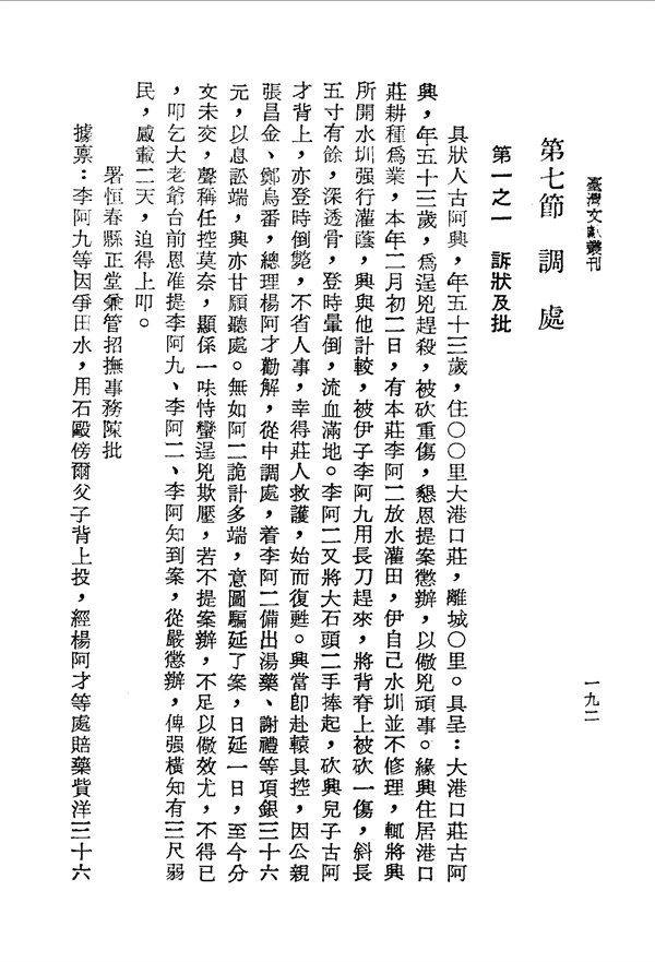 古阿興遇糾紛背上被砍一刀,幸得莊人救護,公親居中協調。 臺灣私法債權編 台灣文獻史料叢刊 -