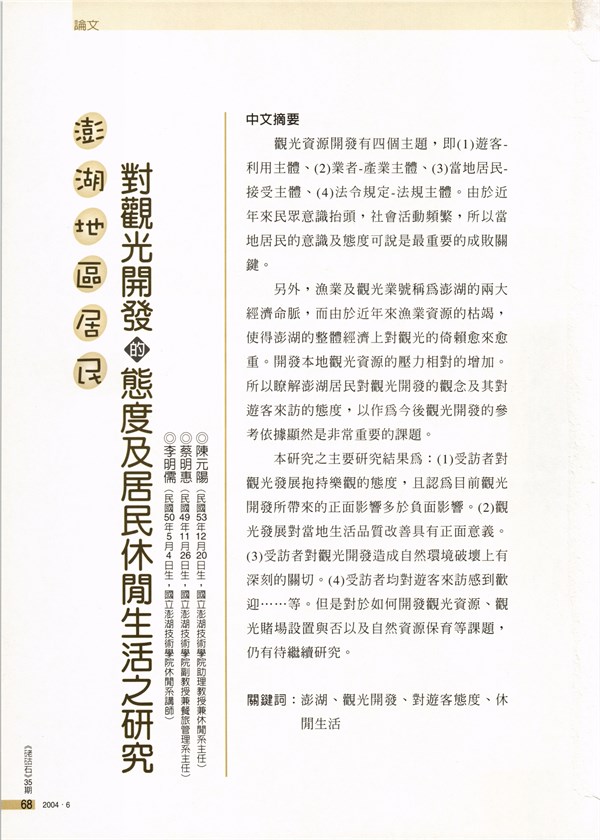 《硓古石》季刊第35期〈澎湖地區居民對觀光開發的態度及居民休閒生活之研究〉 -