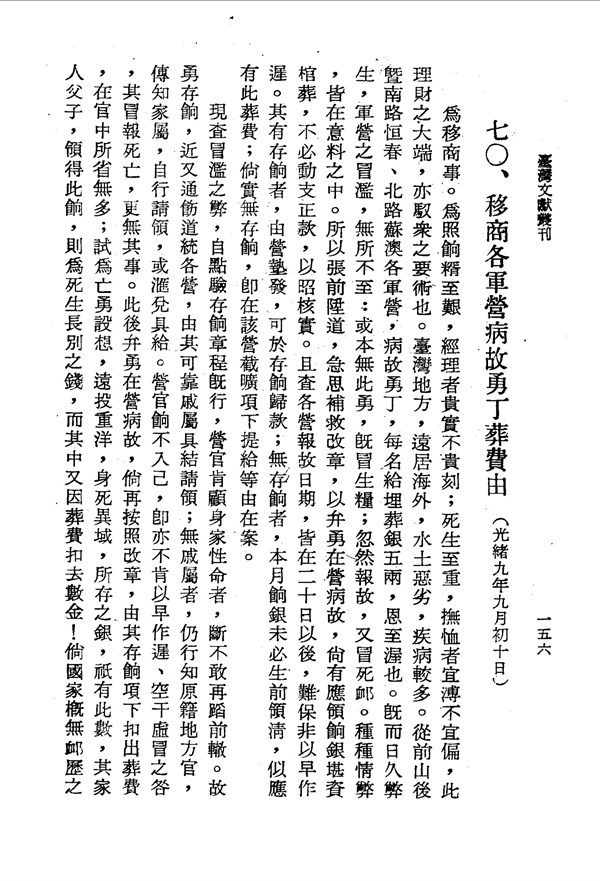 各軍營病故勇丁葬費由 巡臺退思錄卷二 台灣文獻史料叢刊 -