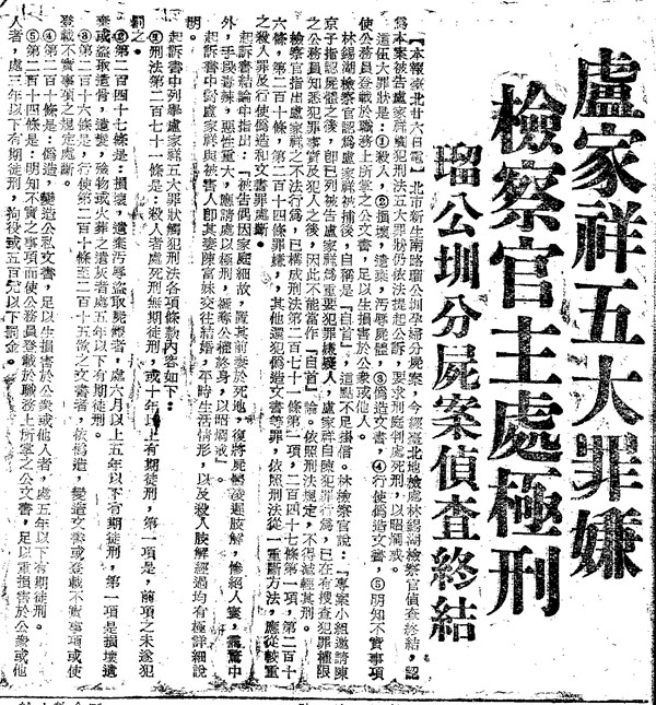 台北分屍案兇手,盧家祥昨晨伏法;臨刑前勸告世人不要作奸犯科,表示殺死陳富妹是件錯誤的事;槍聲兩嚮結束罪惡一生 -