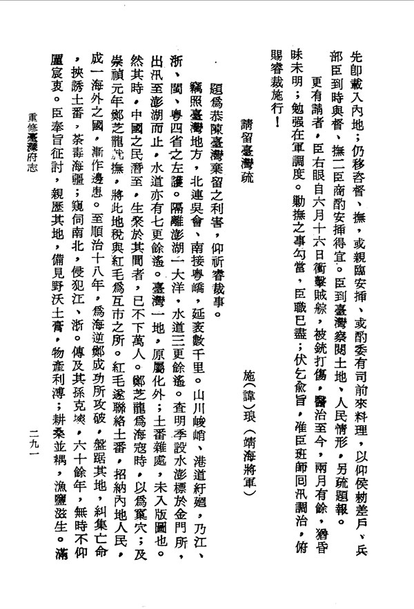 施琅右眼被銃打傷未癒,懇准回汛調治 重修臺灣府志卷十 台灣文獻史料叢刊 -