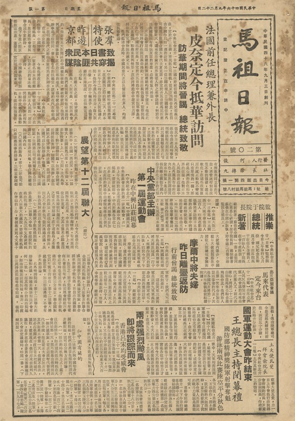 中華民國46年9月22日 馬祖日報 第二O號 第一版 -