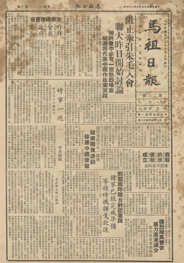 中華民國46年9月24日 馬祖日報 第二二號 第一版