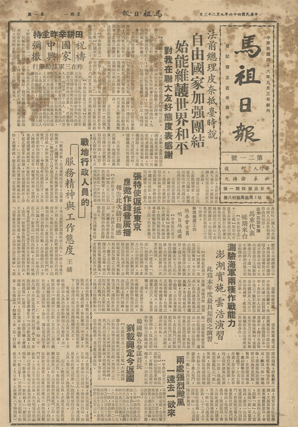 中華民國46年9月23日 馬祖日報 第二一號 第一版 -