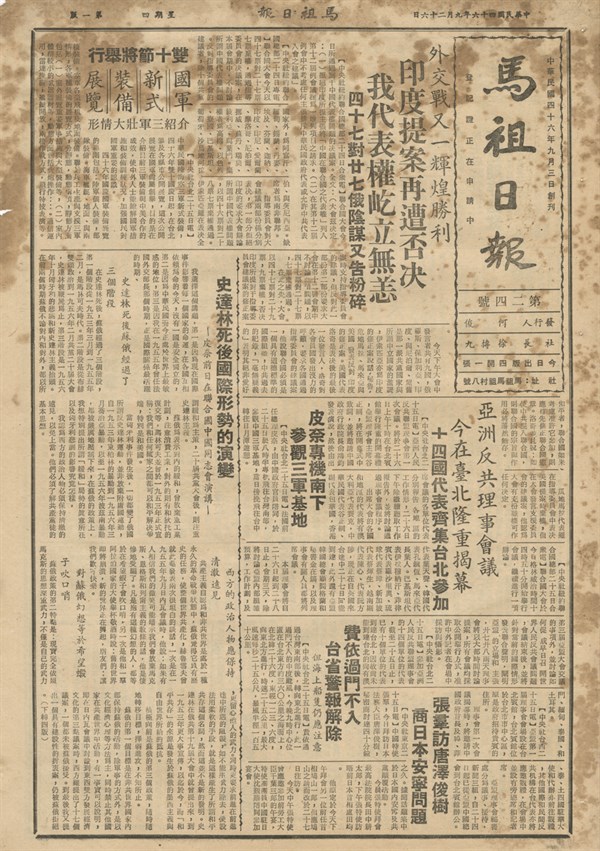 中華民國46年9月26日 馬祖日報 第二四號 第一版 -