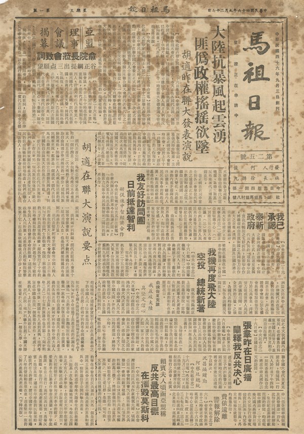中華民國46年9月27日 馬祖日報 第二五號 第一版