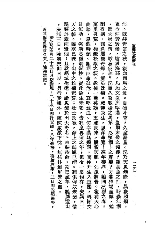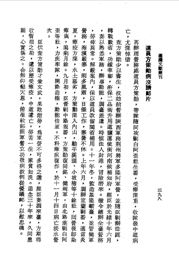 方策勛勦生番受瘴後死 劉壯肅公奏議卷九 台灣文獻史料叢刊 -