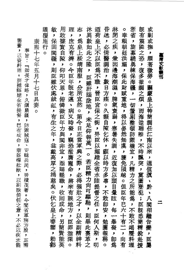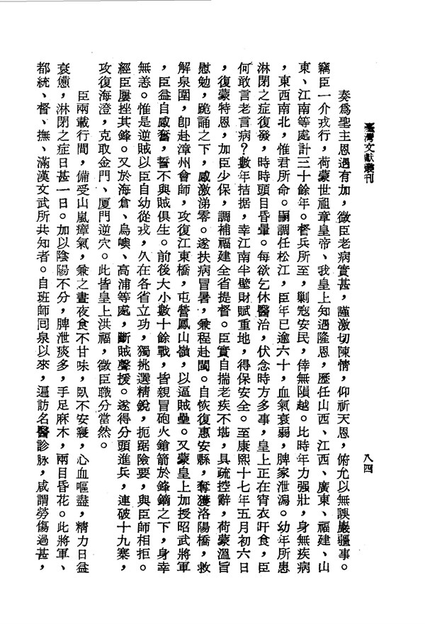 楊捷年紀已高又有淋閉之疾,加上寒暑失調、頭目暈眩,擬請修調養 平閩紀卷之一 台灣文獻史料叢刊 -