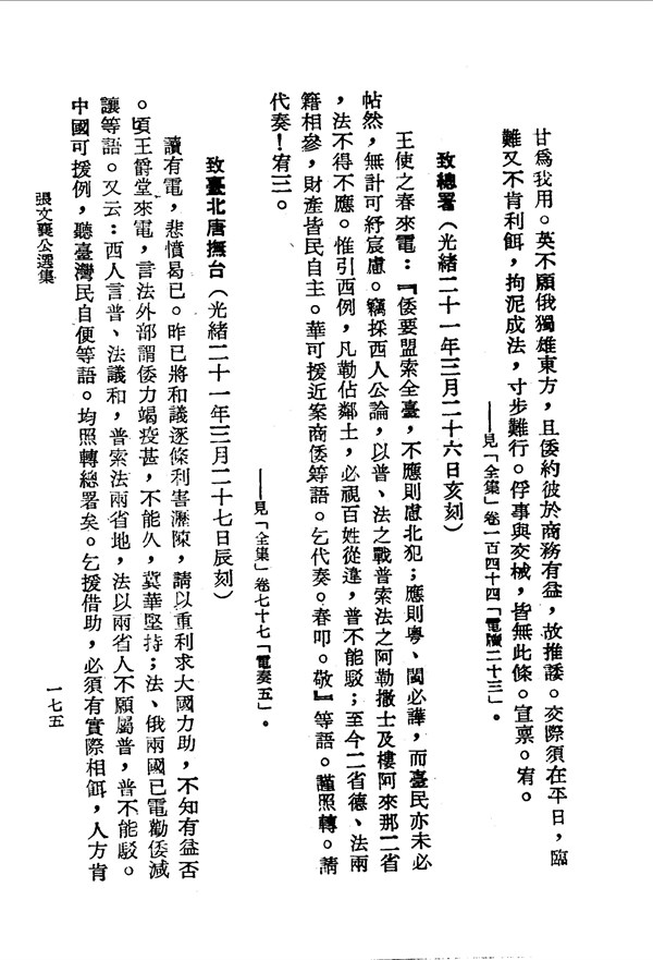 和議之後,王爵堂來電表示法外交部說日本已力竭且多病,法、俄皆已電勸日本讓步,希望中方可以堅持。 張文襄公選集三 台灣文獻史料叢刊 -