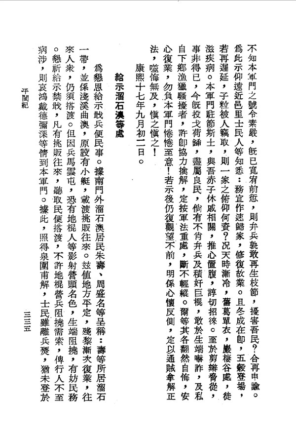 曉諭冬成在即,宜作速歸家,修復故業 平閩紀卷之十二 台灣文獻史料叢刊