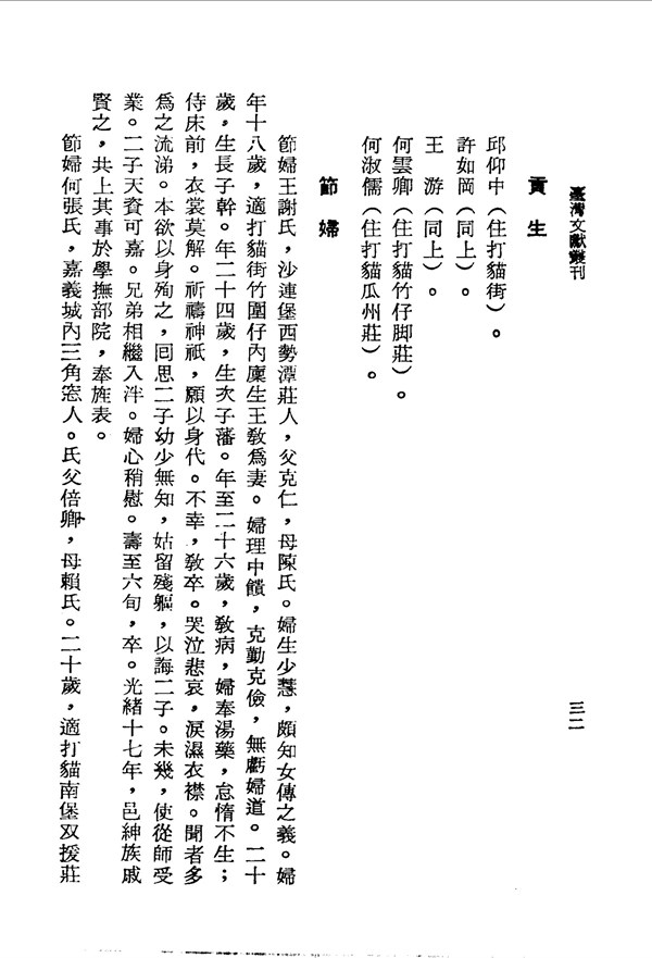 節婦王謝氏克勤克儉,無虧婦道 嘉義管內采訪冊打貓西堡 台灣文獻史料叢刊 -