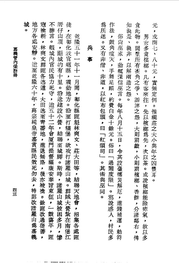應酬以檳榔烟茶為先.解瘴氣 嘉義管內采訪冊打貓西堡 台灣文獻史料叢刊 -