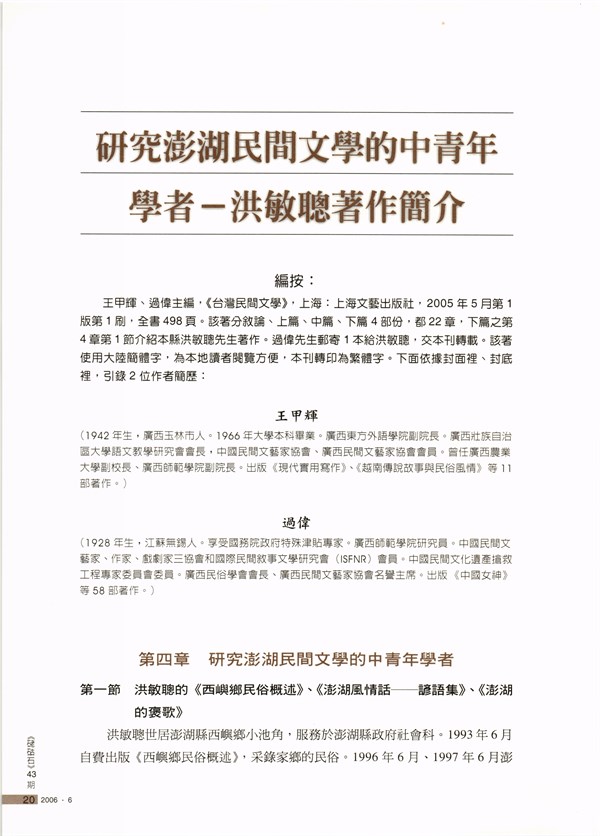 《硓古石》季刊第43期〈研究澎湖民間文學的中青年學者—洪敏聰著作簡介〉 -