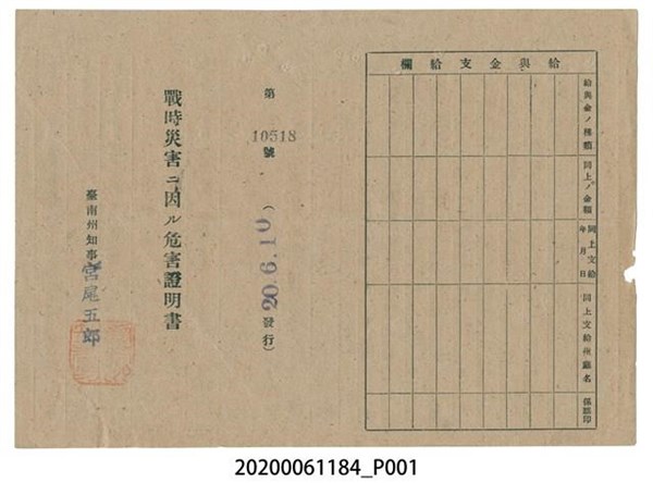戰時造成的意外災害證明書第10520號(昭和20年6月10日發行) -